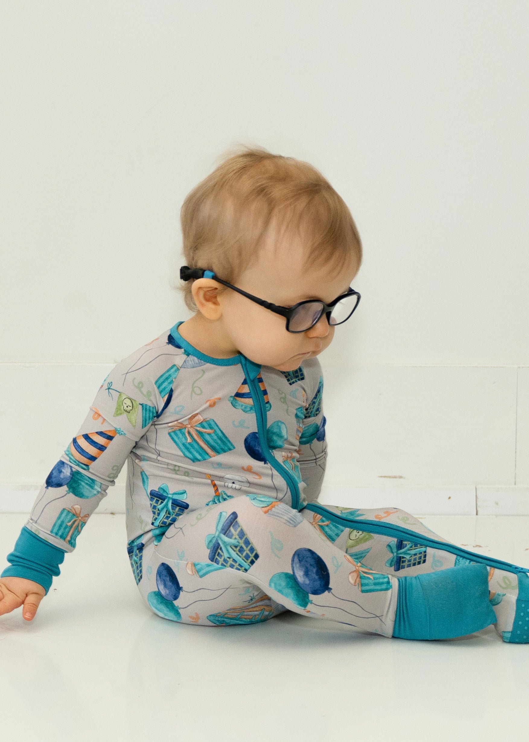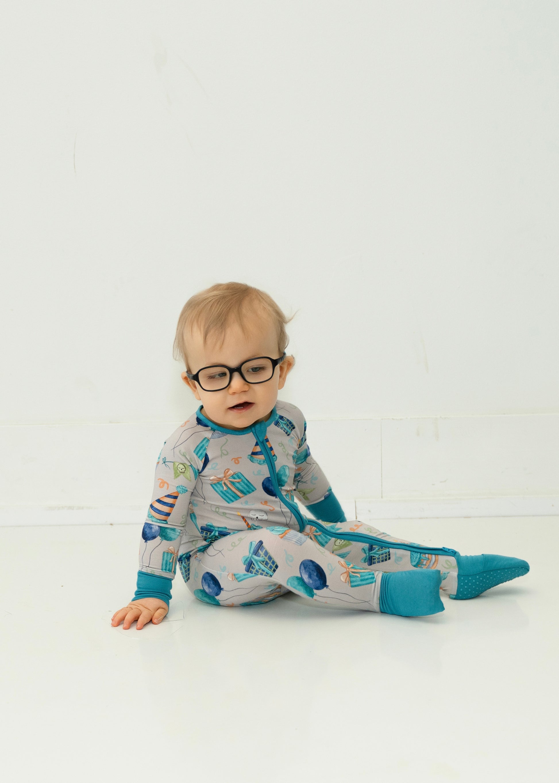 Celebrate in style with our Birthday Bash Zippy! Covered in cheerful balloons, confetti, and party fun, this festive print is perfect for making birthday memories extra special. Made from our signature buttery-soft bamboo, it’s breathable, gentle on sensitive skin, and stretches for all-day comfort. With a two-way zipper for easy changes and built-in foot grips for little partygoers, this Zippy is ready for cake, cuddles, and every joyful moment in between!