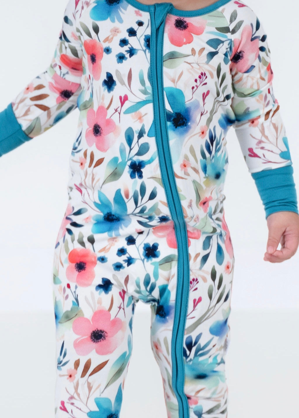 Wrap your little one in the soft, breathable comfort of our Blossom Breeze Zippy. Made from buttery bamboo fabric, this one-piece features a dreamy watercolor floral print with a two-way zipper for easy changes and grips on all sizes for early walkers. Perfect for sensitive skin and year-round comfort.