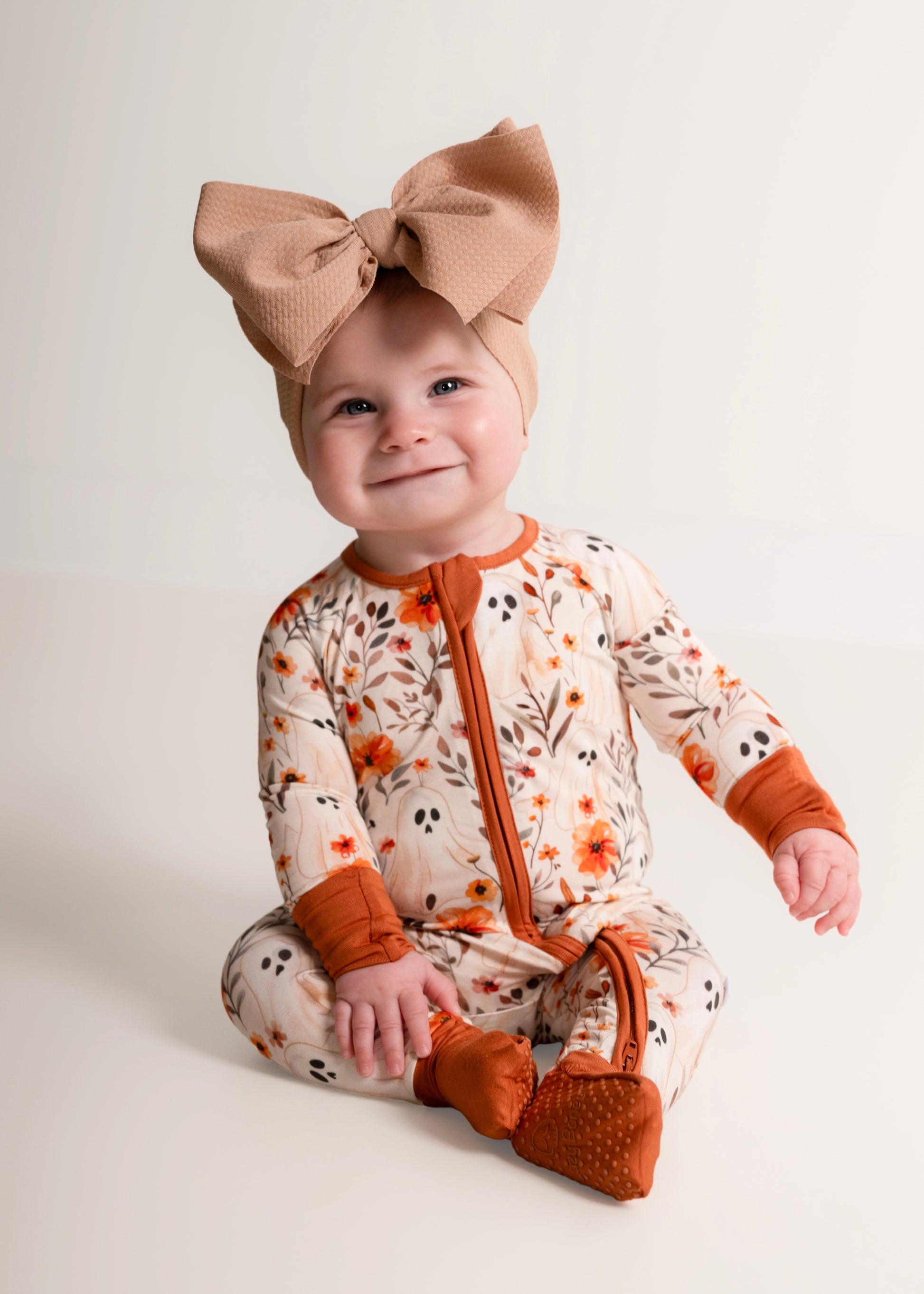 Our Boo-tanical Garden Zippy brings a dreamy blend of fall florals and friendly ghosts to your little one’s wardrobe. Designed for softness and stretch, this bamboo zip romper features warm autumn tones, watercolor flowers, and whimsical ghost illustrations. With fold-over mittens on sizes 6/12M and under, plus foot grips on all sizes, this is the perfect fall essential for babies and toddlers.