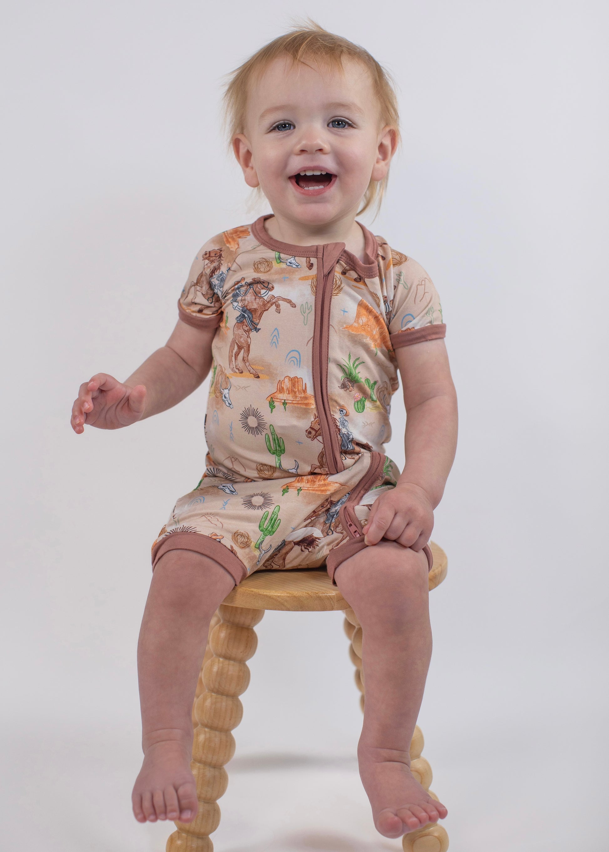 Giddy up and get ready with our Ghost Town Rodeo Shorty! This one-piece romper brings major desert vibes with its whimsical skeleton cowboys, armadillos, and boho-inspired scenery. Designed for warm weather and wild rides, the breathable bamboo fabric keeps your little wrangler cool and comfy all day long.
