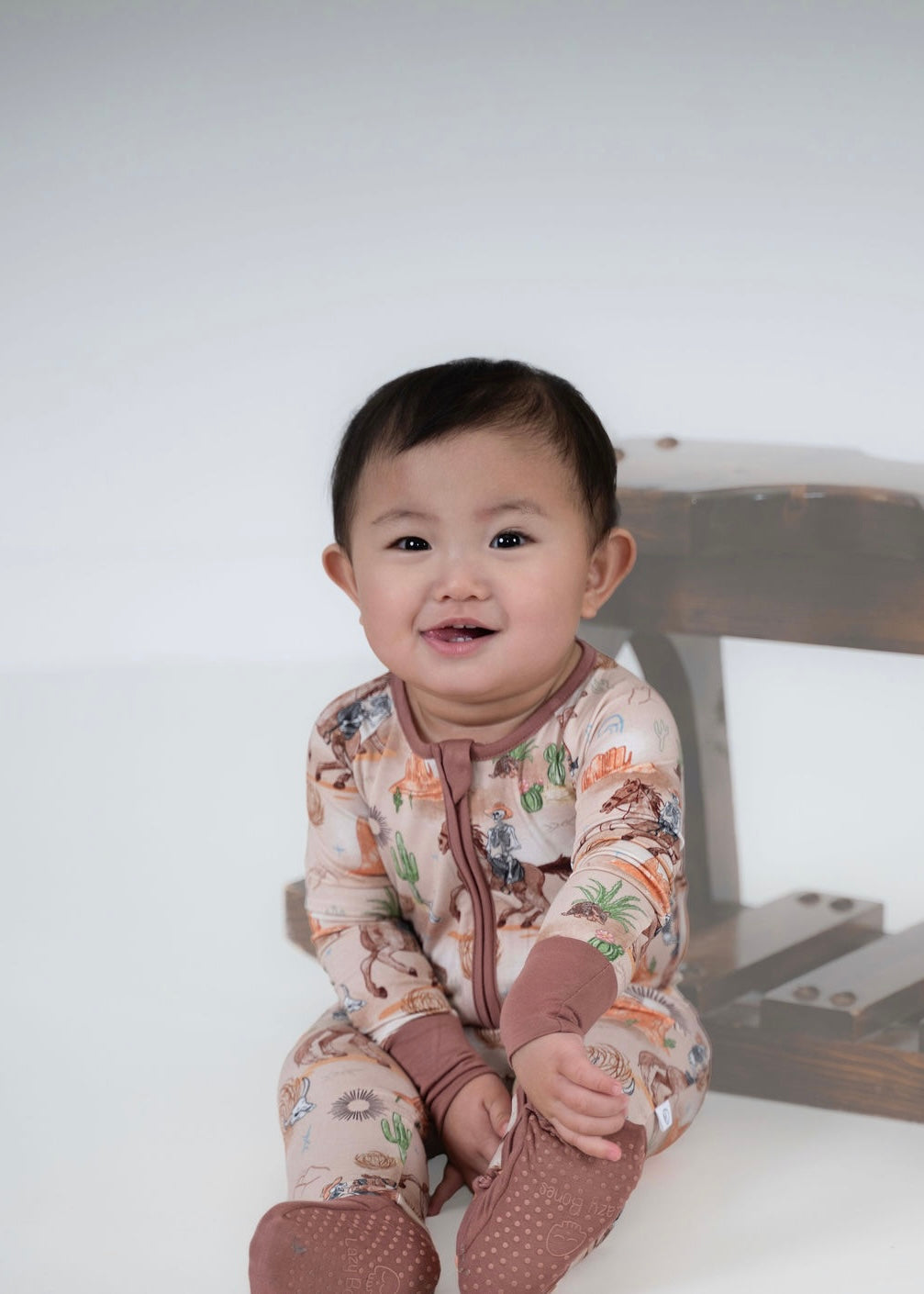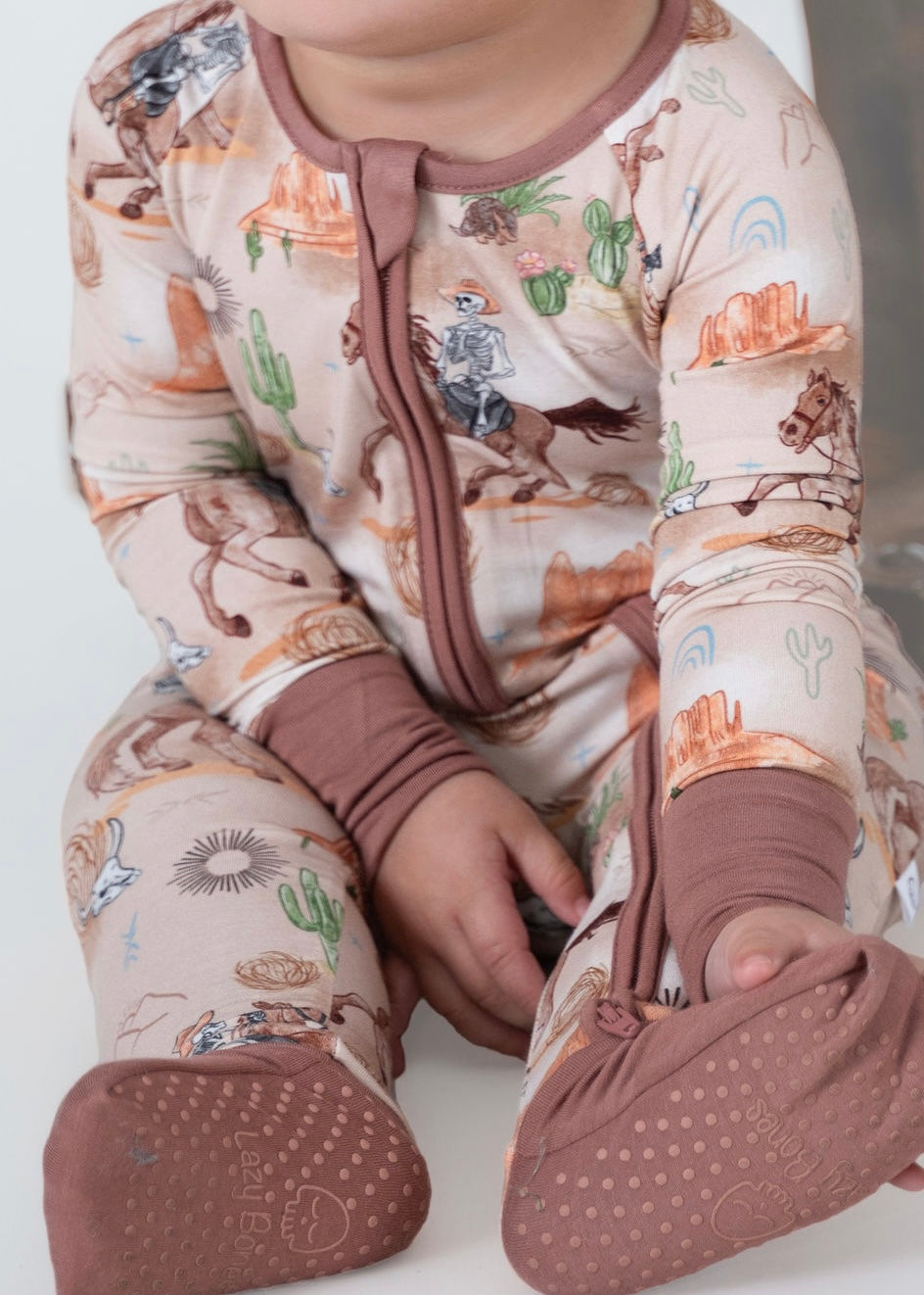 Saddle up for cool adventures with our Ghost Town Rodeo Zippy! This playful print features skeleton cowboys on horseback, quirky armadillos, and a dreamy desert backdrop with a boho twist. Made from our buttery soft bamboo fabric, this one-piece includes a two-way zipper, fold-over mitts and footies (in select sizes), and just the right amount of stretch for all-day comfort. Perfect for your little outlaw with a wild imagination!