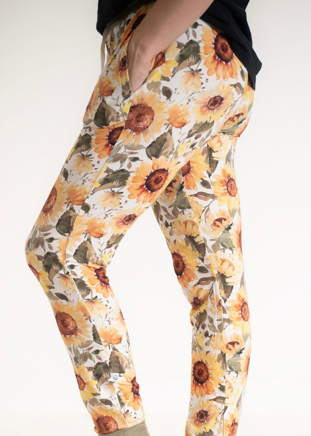 Cozy meets chic in our Golden Fields Adult Joggers. Featuring a relaxed fit, roomy pockets, and our signature bamboo blend, these joggers are made for lounging in style. The watercolor sunflower print adds a touch of rustic charm while the breathable bamboo keeps you comfy year-round.