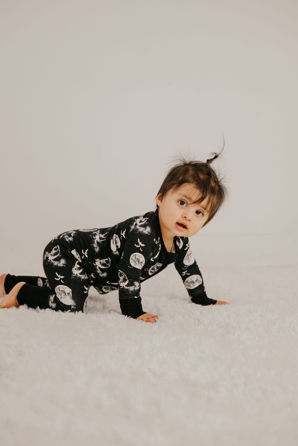 Wrap your little one in cozy, spooky comfort with our Spooky Phases Zippy! Featuring eerie moon phases, drifting clouds, and flying bats against a deep night sky, this zip is perfect for Halloween season snuggles—or year-round moon magic. Made with buttery-soft bamboo, it includes fold-over mittens and feet grips for added comfort and safety.