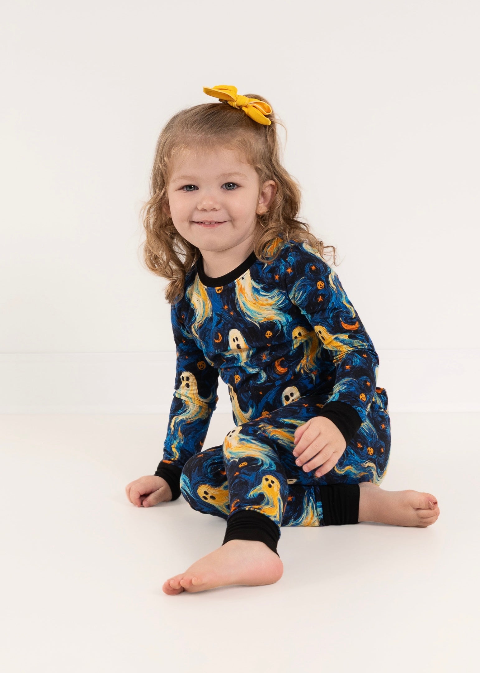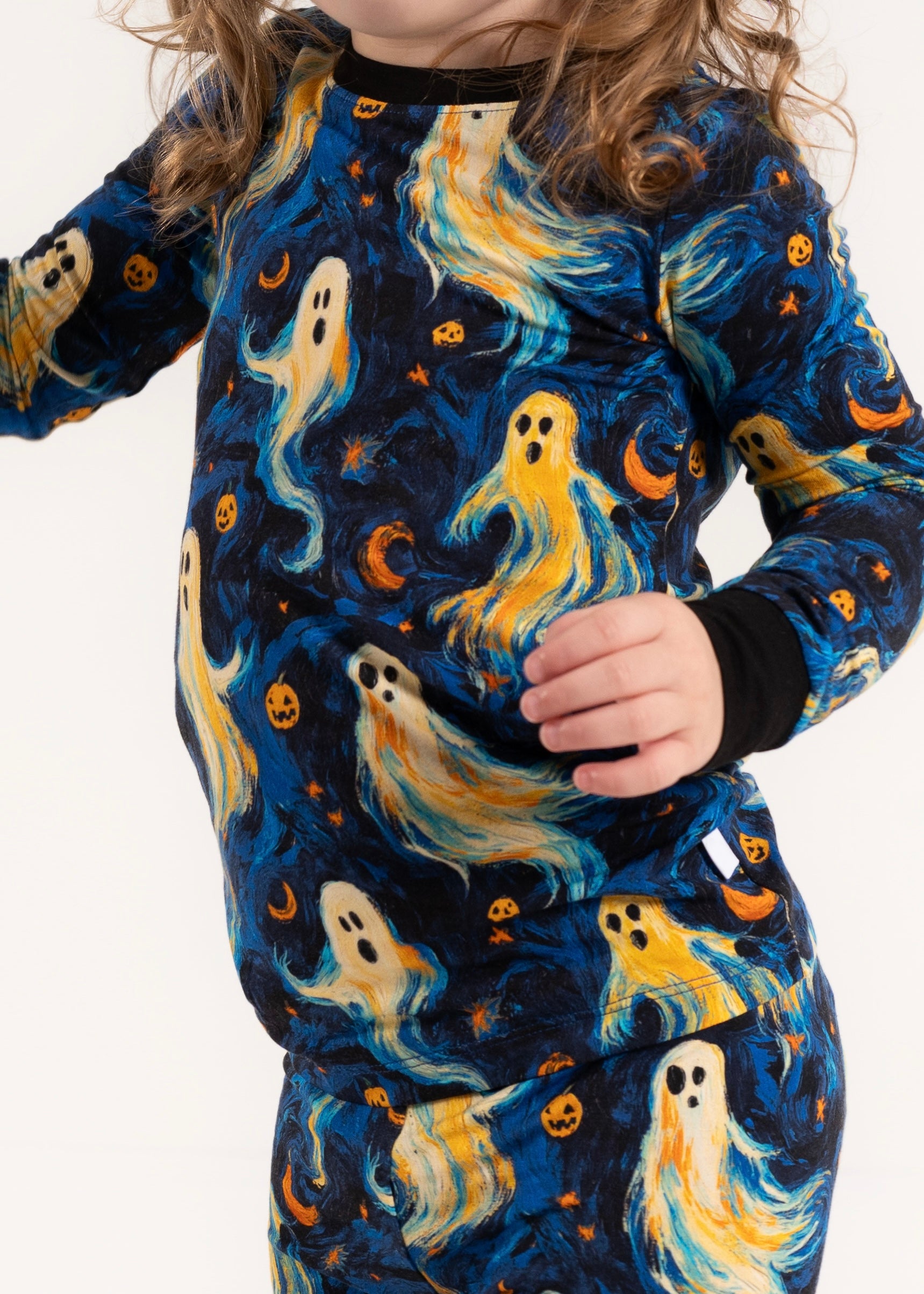 Get your little one ready for a hauntingly comfy night with our Starry Fright 2-piece set! With a whimsical mix of ghostly figures, glowing pumpkins, and Van Gogh-inspired swirls, this set is made from breathable bamboo for a soft, stretchy fit they’ll love all spooky season long.