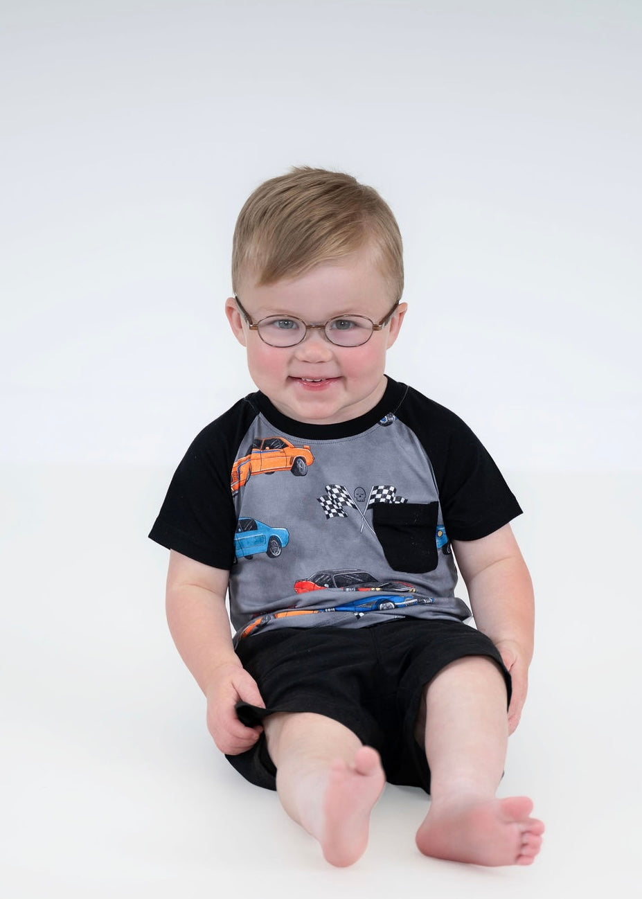 Style meets speed in our Supercharged short sleeve pocket tee. With a custom hand-drawn print of classic muscle cars and a functional front pocket, this tee is made for little ones who live life in the fast lane. Ultra-soft bamboo fabric keeps it cool and comfy, no matter how wild the ride.